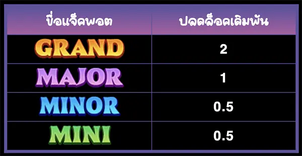 - รางวัล Jackpot คือการเดิมพันของผู้เล่น ที่มีอัตราการคูณที่แน่นอน
