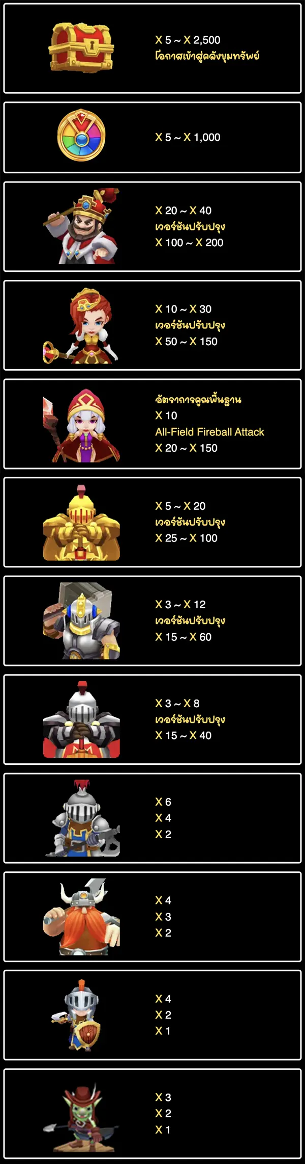 - รางวัลจาก (รูป4) และ (รูป7) รวม 0.1x、0.2x、0.5x、0.8x、1x、1.5x、2x、2.5x และ 3x ของเงินลงทะเบียน รางวัลที่ได้จาก (รูป5) รวม 3x、4X และ MINI、6x、7x、8x และ MINOR、12.5x และ 15x และ 17.5x และ 20x และ 30x และ MAJOR และ 100x