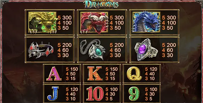 - เกมนี้ใช้ตารางการจ่ายเงินแบบไดนามิกและการจ่ายสัญลักษณ์ที่แสดงด้านล่างแสดงถึงจำนวนเงินที่ได้รับรางวัลสำหรับการได้ชุดค่าผสมในระดับการเดิมพันที่เลือกในปัจจุบัน