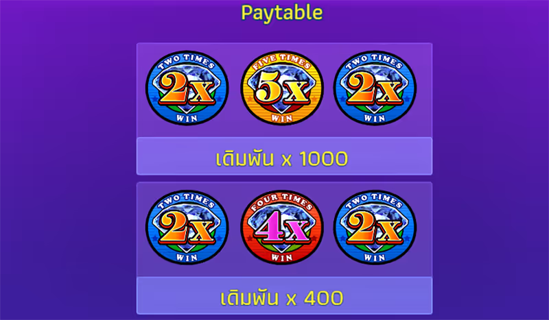 ฟีเจอร์คูณรางวัลสูงสุด 10 เท่าฟีเจอร์ที่โดดเด่นที่สุดของเกมนี้คือระบบคูณรางวัลที่สามารถเพิ่มเงินรางวัลได้ถึง 10 เท่า! ช่วยให้ผู้เล่นสามารถทำกำไรได้มากขึ้นจากการหมุนแต่ละครั้งธีมและกราฟิกหรูหราธีมของเกมคือเพชรและสัญลักษณ์มูลค่าสูง เช่น “7” ที่ทำให้เกมดูหรูหราและมีความสง่างาม การออกแบบกราฟิกและเอฟเฟกต์เสียงยังเพิ่มความสนุกตื่นเต้นในการเล่นเป็นเกมสล็อตที่เหมาะสำหรับผู้ที่ต้องการความสนุกและกำไรในเกมเดียว ด้วยฟีเจอร์การคูณเงินรางวัลที่เพิ่มโอกาสทำกำไรได้ถึง 10 เท่า และระบบโบนัสพิเศษที่จะช่วยให้คุณคว้ารางวัลใหญ่ง่ายขึ้นตัวเกมถูกออกแบบมาให้เข้าถึงง่าย ไม่ซับซ้อน เหมาะสำหรับทั้งผู้เล่นมือใหม่และผู้ที่มีประสบการณ์ในการเล่นสล็อต นอกจากนี้ยังสามารถเล่นได้บนทั้งมือถือและคอมพิวเตอร์ ซึ่งทำให้ผู้เล่นสามารถเข้าเล่นได้ทุกที่ทุกเวลา