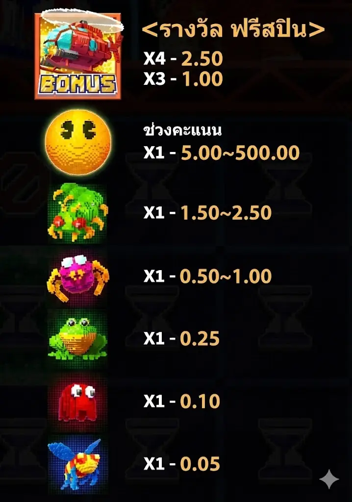 - สัญลักษณ์ Bonus = X4 – 2.50, X3 – 1.00