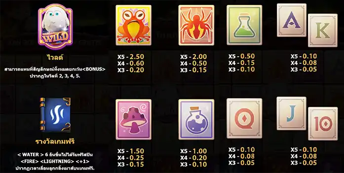 - สัญลักษณ์ คัมภีร์ = WATER 6 อันขึ้นไปได้รับฟรีสปิน FTRE, LIGHTNING, +1
