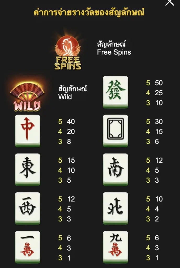 - เพย์ไลน์และสัญลักษณ์: ในเกมจะมีสัญลักษณ์ที่เกี่ยวข้องกับไพ่ Mahjong ต่าง ๆ ซึ่งอาจมีการจ่ายรางวัลตามการจับคู่ของสัญลักษณ์เหล่านั้น
