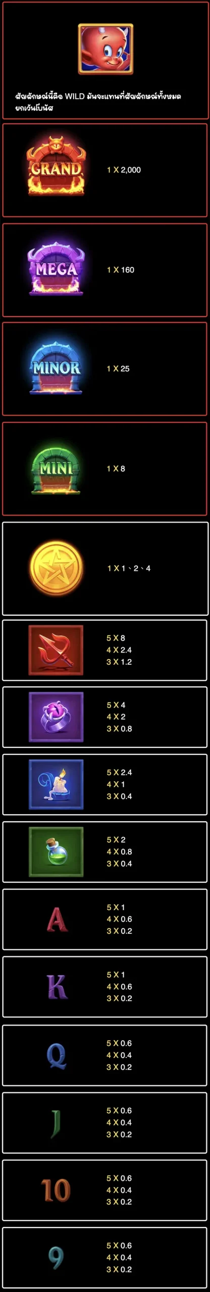 นี่คือสล็อตแอนิเมชั่นที่ดึงดูดใจด้วยปีศาจแดงจอมซนที่เพิ่มเสน่ห์ให้กับเกม ตารางเกมดูเรียบง่าย เพลงประกอบเข้ากับบรรยากาศความซุกซน และหมูทองคำทำให้การเตรียมตัวก่อนถึงรอบฟรีสปินสนุกสนานยิ่งขึ้น เกมหลักออกแบบมาให้เล่นง่าย แต่รางวัลเหรียญและแจ็คพอตแบบสะสมช่วยให้เกมน่าสนใจอยู่เสมอในขณะที่คุณรอให้สัญลักษณ์ Wild ปรากฏ เมื่อมันปรากฏแล้ว ระบบการคำนวณก็จะทำงานอย่างรวดเร็ว ผมชอบที่ฟีเจอร์ต่างๆ ทำงานได้ทั้งสองรอบ มันเป็นตัวเลือกที่ดีสำหรับการเล่นที่มีความเสี่ยงปานกลาง และผมแนะนำให้เล่นเป็นชุดๆ โดยปล่อยให้ปีศาจเป็นผู้ป้อนอาหารให้หมูและจัดการเรื่องยากๆ เอง