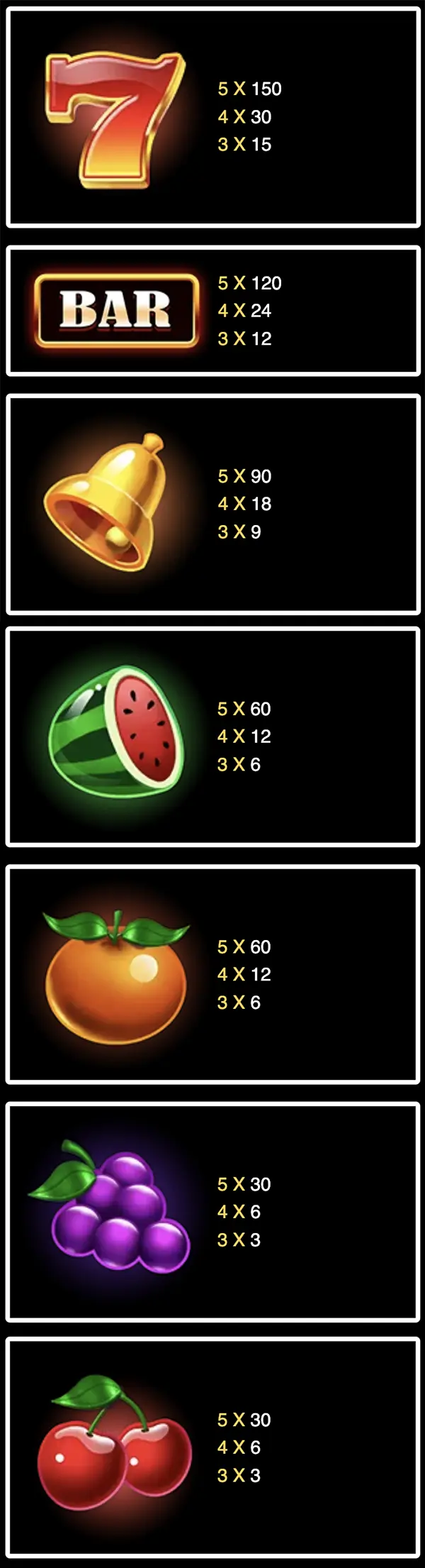 - เกมนี้ใช้ตารางการจ่ายเงินแบบไดนามิกและการจ่ายสัญลักษณ์ที่แสดงด้านล่างแสดงถึงจำนวนเงินที่ได้รับรางวัลสำหรับการได้ชุดค่าผสมในระดับการเดิมพันที่เลือกในปัจจุบัน