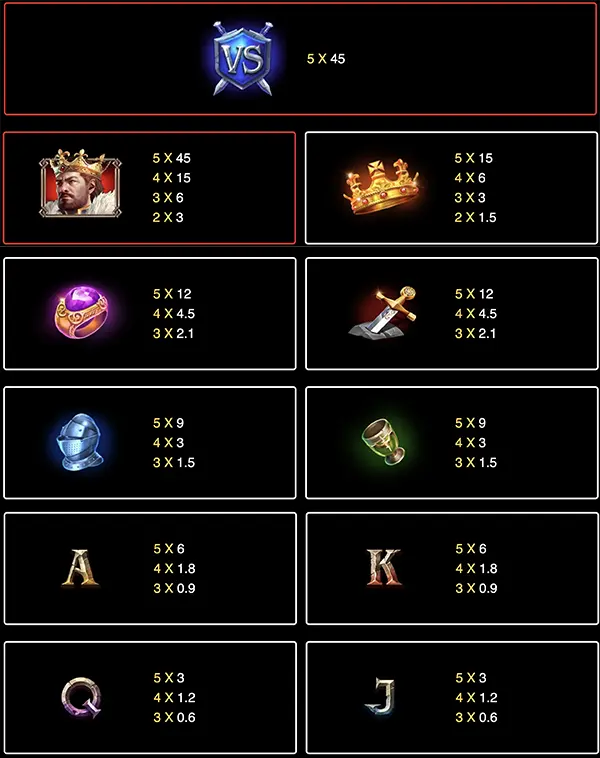 สัญลักษณ์ VS เป็นสัญลักษณ์พิเศษที่จะขยายเป็น Duel Reel เมื่อเปิดใช้งาน Duel Reel ในแต่ละรีลจะมี ตัวคูณ WILDr สองตัว โดยแต่ละตัวจะแทนด้วยอัศวิน อัศวินจะมีการต่อสู้กันเองและตัวคุณของอัศวินที่ชนะจะถูกนำไปใช้กับทั้งรีล สัญลักษณ์ VS สีน้ำเงินจะปรากฏอยู่ในเกมหลัก และสัญลักษณ์ VS สีแดงปรากฏอยู่ใน Free Spins