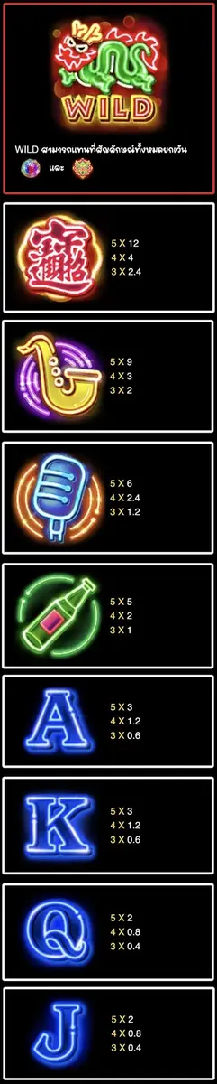 Jili Games พยายามถ่ายทอดบรรยากาศของเมืองใหญ่ในเอเชียยามค่ำคืน และพวกเขาก็ทำได้ค่อนข้างดีทีเดียว ด้วยการออกแบบที่ดีและสัญลักษณ์ที่มีสไตล์ คุณจะเห็น แสงไฟ นีออนมังกร ลูกบอลดิสโก้ และไมโครโฟน ท่ามกลางฉากหลังของถนนมืดๆ ที่มีสีแดงเป็นจุดเด่น แม้ว่ากราฟิกจะสดใสและสวยงาม แต่ก็ยังไม่เทียบเท่ากับคุณภาพของสล็อตจาก Betsoft หรือ Pragmatic อย่างไรก็ตาม สิ่งนี้ได้รับการชดเชยด้วยลวดลายแบบตะวันออกและจังหวะดนตรีแบบเมืองในด้านการออกแบบเสียง