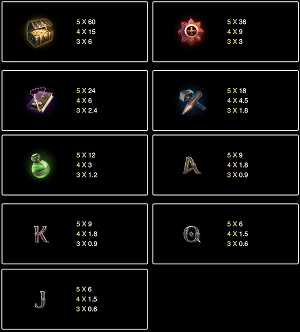 - เกมนี้ใช้ตารางการจ่ายเงินแบบไดนามิกและการจ่ายสัญลักษณ์ที่แสดงด้านล่างแสดงถึงจำนวนเงินที่ได้รับรางวัลสำหรับการได้ชุดค่าผสมในระดับการเดิมพันที่เลือกในปัจจุบัน