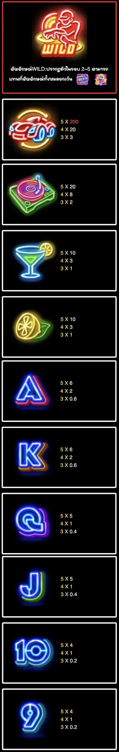 ตารางสรุปภาพรวมของเกม PartyNight