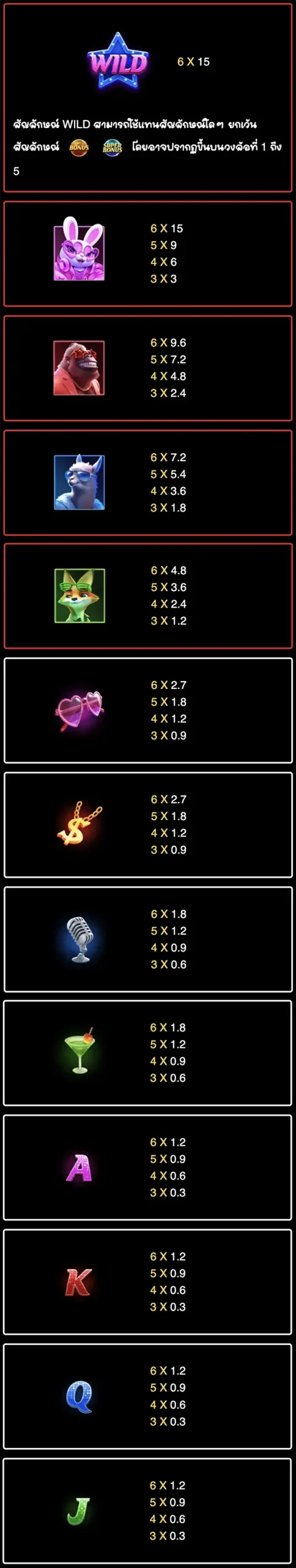 เกม Party Star เป็นเกมสล็อตที่เต็มไปด้วยพลังและความตื่นเต้น ดีเจกระต่ายสุดน่ารักในชุดสีชมพูและแว่นกันแดดรูปหัวใจ ขึ้นมาเป็นจุดเด่น เปิดเพลงและสร้างบรรยากาศให้สนุกสุดเหวี่ยงในค่ำคืนสุดพิเศษ เหล่าสัตว์ปาร์ตี้หลากสีสันมาร่วมสนุก เพิ่มสีสันให้กับบรรยากาศด้วยท่าเต้นสุดมันส์ ฉากหลังเต็มไปด้วยแสงไฟนีออนและเสียงเพลงจังหวะเร้าใจ สร้างประสบการณ์เสมือนจริงที่พาผู้เล่นไปสู่บรรยากาศไนท์คลับสุดอลังการ