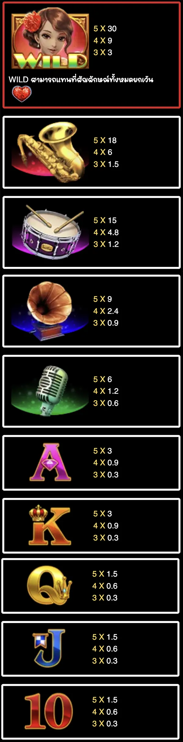 - การชนะและการจ่ายเงินจะเป็นไปตามตารางการจ่ายเงิน