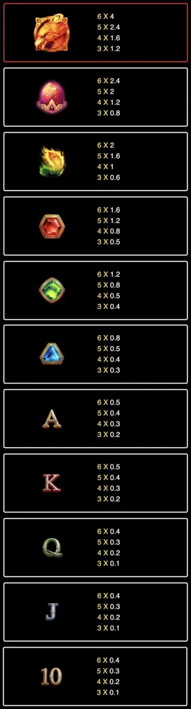 นกฟีนิกซ์เป็นสัตว์อมตะ แต่ต้องผ่านพิธีนิพพานทุกๆ 500 ปี และร่างที่เกิดใหม่จะกลับมาสู่โลกอีกครั้ง! นกฟีนิกซ์ที่กำลังเข้าสู่พิธีนิพพานนั้นเปราะบางมาก มันเป็นการทดสอบครั้งใหญ่ที่สุดในชีวิต ดังนั้นมันจึงต้องการผู้ปกป้องและช่วยเหลือ นกฟีนิกซ์ที่เกิดใหม่จะมอบผลผลิตและความมั่งคั่งอันไม่มีที่สิ้นสุดให้กับผู้พิทักษ์ เกมจะเก็บสัญลักษณ์ที่ชนะไว้ในระหว่างกระบวนการ กำจัดสัญลักษณ์ที่ไม่ชนะ และแสดงสัญลักษณ์ใหม่ เมื่อจำนวนสัญลักษณ์ที่ชนะสะสมถึงระดับหนึ่ง กระดานจะขยายออก จำนวนการเชื่อมต่อคือ 729 → 4096 → 15625 วิธี ซึ่งจะขยายออกไปเรื่อยๆ! ในเกมฟรี เมื่อจบเกมแต่ละครั้ง สัญลักษณ์ที่ชนะจะถูกสุ่มเลือกและอัปเกรดเป็นสัญลักษณ์ที่สูงกว่า และยังมีโอกาสที่จะกำจัดสัญลักษณ์ที่ชนะอีกครั้ง เหมือนกับการเกิดใหม่ของนกฟีนิกซ์ ที่ให้โอกาสคุณชนะอีกครั้ง