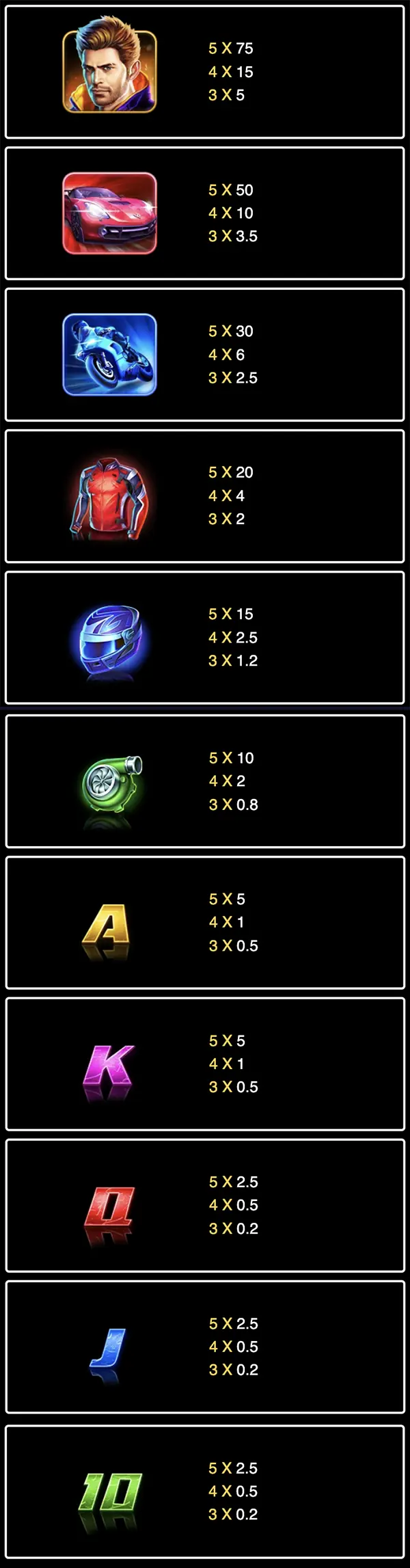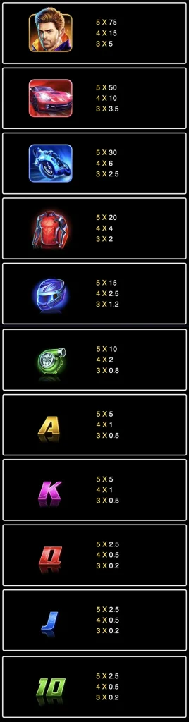 Wild Racersเป็นสล็อตเกมแข่งรถจากผู้พัฒนาเกมสล็อต ดีไซน์ของสล็อต WildRacers นั้นสวยงามและมีคุณภาพสูง ภาพทั้งหมดใช้สีนีออนสดใส สร้างความรู้สึกถึงความมีชีวิตชีวาและพลังของการแข่งรถจริง ๆ สล็อตนี้มี 5 รีลและ 20 เพย์ไลน์ รวมถึงฟีเจอร์ต่าง ๆ มากมาย หนึ่งในฟีเจอร์ที่น่าสนใจในสล็อต Wild Racers คือ ฟรีสปินพร้อมฟีเจอร์เสริมในรูปแบบของตัวคูณและฟรีสปินเพิ่มเติม นอกจากนี้ เกมยังมีฟีเจอร์ “โหมดเทอร์โบ” ที่ช่วยให้คุณเร่งความเร็วในการเล่นเกม และฟีเจอร์ “เล่นอัตโนมัติ” ที่ช่วยให้ผู้เล่นเริ่มการหมุนอัตโนมัติโดยไม่ต้องกดปุ่มหมุนทุกครั้ง ตามที่ผู้พัฒนาเกมระบุไว้ การชนะสูงสุดใน WildRacers สามารถสูงถึง 2000 เท่าของเงินเดิมพัน