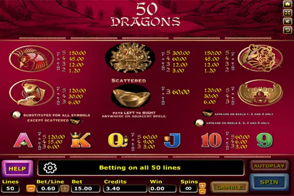 Fifty Dragons ได้รับแรงบันดาลใจจากตำนานมังกรจีนและความเชื่อเรื่องพลังแห่งธรรมชาติ มังกรแต่ละสายเป็นตัวแทนของโชค ทรัพย์ และพลังอำนาจ ภายในเกม ผู้เล่นจะได้สัมผัสบรรยากาศจีนโบราณ เต็มไปด้วยลวดลายมงคล วังจีน และพลังศักดิ์สิทธิ์ ทุกการหมุนเปรียบเสมือนการเรียกพลังมังกร เพื่อเปิดทางสู่ทรัพย์สมบัติและเงินรางวัล