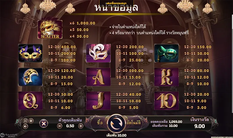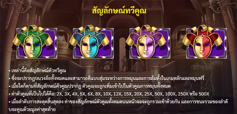 Masquerade จากค่าย JOKER GAMING เป็นเกมสล็อตแนวหรูหราโรแมนติก ที่พาผู้เล่นเข้าสู่โลกของงานเต้นรำสวมหน้ากากสุดลึกลับ เต็มไปด้วยบรรยากาศของชนชั้นสูง ความงดงาม และความลับที่ซ่อนอยู่ภายใต้หน้ากาก ตัวเกมโดดเด่นด้วยโทนภาพที่ดูสง่างาม ผสมผสานความลึกลับและความโรแมนติกได้อย่างลงตัวผู้เล่นจะได้สัมผัสบรรยากาศของงานเลี้ยงในพระราชวัง ที่ทุกคนสวมหน้ากากเพื่อปกปิดตัวตน พร้อมทั้งลุ้นโชคและรางวัลจากการหมุนวงล้อในค่ำคืนแห่งความลับนี้
