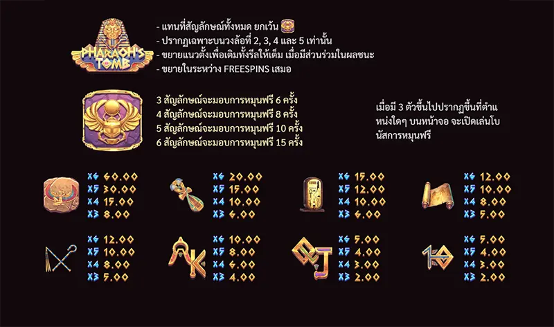 Wild (ฟาโรห์) – ใช้แทนสัญลักษณ์อื่น ๆ เพื่อช่วยให้ชุดชนะเกิดขึ้นได้ง่ายกว่า