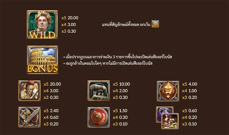 สัญลักษณ์ในเกมสะท้อนถึงอำนาจและวัฒนธรรมของจักรวรรดิโรมัน จักรพรรดิ / นักรบโรมัน สัญลักษณ์มูลค่าสูงสุด ให้รางวัลมากที่สุดเมื่อเรียงครบตามเพย์ไลน์ หมวกนักรบ / โล่ / ดาบ สัญลักษณ์มูลค่าสูงรองลงมา ให้รางวัลเด่นและออกบ่อย เสาโรมัน / เหรียญทอง มูลค่าปานกลาง สัญลักษณ์ไพ่ A, K, Q, J มูลค่าต่ำ WILD ใช้แทนสัญลักษณ์ทั่วไป (ยกเว้น SCATTER) ช่วยเชื่อมเพย์ไลน์และเพิ่มโอกาสชนะ SCATTER ใช้เปิดฟีเจอร์ฟรีสปิน ไม่จำเป็นต้องเรียงตามเส้นจ่าย