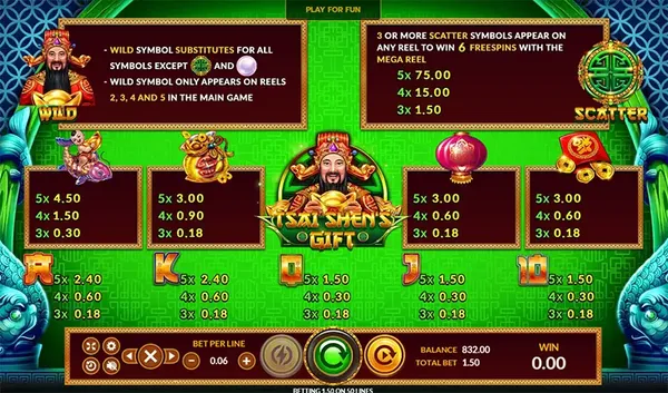 สัญลักษณ์ในเกมล้วนเป็นสัญลักษณ์แห่งความโชคดีและความมั่งคั่ง ไฉ่ซิงเอี๊ย (Tsai Shen) สัญลักษณ์มูลค่าสูงสุด ให้รางวัลมากที่สุดเมื่อเรียงครบตามเพย์ไลน์ ถุงเงิน / เหรียญทอง / แท่งทอง สัญลักษณ์มูลค่าสูงรองลงมา ให้รางวัลเด่นและออกบ่อย โคมแดง / ซองอั่งเปา มูลค่าปานกลาง สัญลักษณ์ไพ่ A, K, Q, J มูลค่าต่ำ WILD ใช้แทนสัญลักษณ์ทั่วไป (ยกเว้น SCATTER) ช่วยเพิ่มโอกาสสร้างไลน์ชนะ SCATTER / BONUS ใช้เปิดฟีเจอร์ฟรีสปินหรือโบนัสไม่จำเป็นต้องเรียงตามเส้นจ่าย