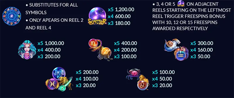 สัญลักษณ์จะถูกออกแบบให้เข้ากับธีมของจักรราศี โดยสามารถแบ่งออกเป็นสัญลักษณ์ทั่วไปและสัญลักษณ์พิเศษดังนี้ สัญลักษณ์พิเศษ Wild ช่วยแทนสัญลักษณ์อื่น(ยกเว้น Scatter) เพื่อช่วยสร้างการชนะ Scatter ซึ่งเมื่อปรากฏครบจำนวนที่กำหนดจะเข้าสู่โหมดฟรีสปินสัญลักษณ์หลักจากธีมจักรราศีสัญลักษณ์ราศีต่างๆ ถูกออกแบบมาให้มีค่าการจ่ายที่แตกต่างกันแต่ละราศีจะจ่ายรางวัลตามจำนวนที่เข้าคู่กันบนวงล้อ