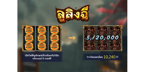 - เปิดได้สัญลักษณ์ที่เหมือนกัน 9 อันใน 1 เกม จะได้รับเกมฟรี 8 เกมทันที