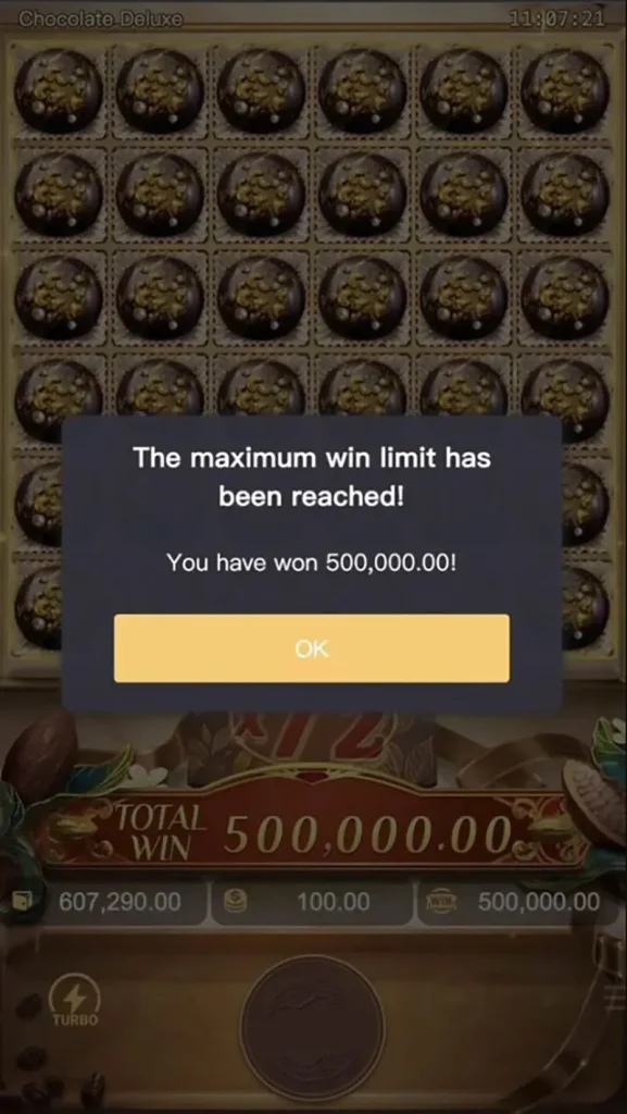 - หากยอดชนะทั้งหมดในเกมหลักหรือฟีเจอร์หมุนซ้ำจนกว่าจะชนะถึง 5,000 เท่าของจำนวนเงินเดิมพัน การหมุนจะสิ้นสุดลง
