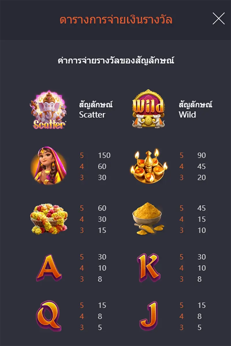 ตารางสรุปภาพรวมของเกม Ganesha Gold