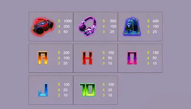 - จะพาผู้เล่นดำดิ่งสู่บรรยากาศคลับ ที่มีชีวิตชีวา เต็มไปด้วยพลัง เกมนี้มีสัญลักษณ์ต่างๆ เช่น ลำโพง หูฟัง ไมโครโฟน และแผ่นเสียงไวนิล ซึ่งแต่ละสัญลักษณ์ล้วนส่งเสริมธีมโดยรวม และเพิ่มประสบการณ์การเล่นเกม