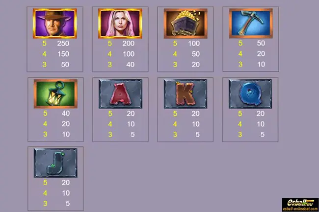 - สัญลักษณ์ Scatter ของเกม ซึ่งมีรูปร่างเป็นคนขุดอัญมณีผมแดง สามารถเรียกใช้งานฟรีสปินได้ หากสัญลักษณ์นี้ปรากฏบนวงล้อที่สอง สาม และสี่ ผู้เล่นจะได้รับฟรีสปิน 12 ครั้งในระหว่างฟรีสปิน สัญลักษณ์ที่จ่ายสูงสุดจะมีรูปร่างเป็นสัญลักษณ์ขนาดใหญ่