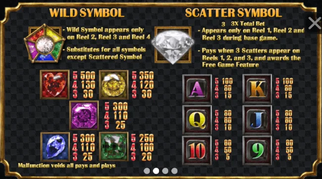 - สัญลักษณ์ที่มีมูลค่าสูง ได้แก่ อัญมณีล้ำค่าต่างๆ อัญมณีสีเขียว สีน้ำเงิน และสีม่วง 3 เม็ด จะให้รางวัลระหว่าง 20-300 เท่าของเงินเดิมพันต่อไลน์