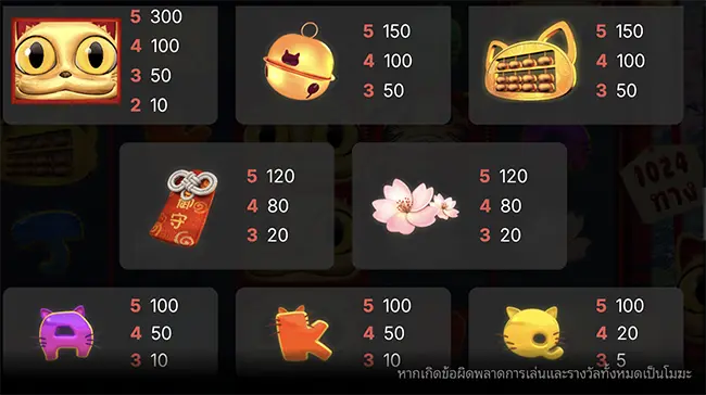- สัญลักษณ์ที่ให้รางวัลสูงสุดคือสัญลักษณ์แมว ซึ่งจะให้ 300 เหรียญหากเรียงกัน 5 ตัว