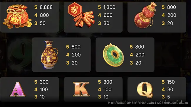 - ยกเว้นในช่วงรอบฟีเจอร์ Scatter ผู้เล่นจะได้รับไอเท็มสี่ชิ้นจากแปดชิ้น และแต่ละไอเท็มจะเปิดเผยรางวัลสูงสุด 100 เท่าของเงินเดิมพันที่เรียกใช้