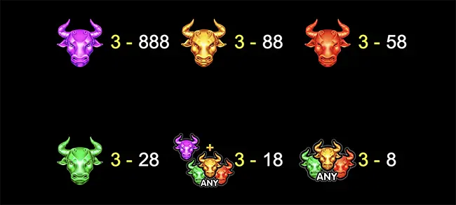 - สัญลักษณ์วัวใดๆ – จ่าย 8 เท่าของเงินเดิมพันของคุณสำหรับการชนะแบบ 3 ตัวเหมือนกัน