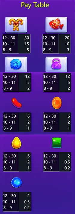 เกมนี้จ่ายรางวัลตามจำนวนสัญลักษณ์ที่ปรากฏบนหน้าจอ (ตั้งแต่ 8 อันขึ้นไป) โดยมีรายละเอียดดังนี้ครับ: