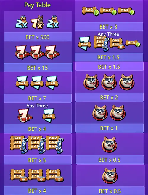 สัญลักษณ์ที่ปรากฏ รายละเอียดการจ่าย สุนัข 2x + 7x + 2x จ่าย 500 เท่า ของเงินเดิมพัน เลข 7 สีแดง 3 อัน จ่าย 15 เท่า ของเงินเดิมพัน เลข 7 BAR 3 อัน จ่าย 7 เท่า ของเงินเดิมพัน เลข 7 (สีใดก็ได้) ผสมกัน 3 อัน จ่าย 4 เท่า ของเงินเดิมพัน BAR 3 ชั้น (สีน้ำเงิน) 3 อัน จ่าย 5 เท่า ของเงินเดิมพัน BAR 2 ชั้น (สีส้ม) 3 อัน จ่าย 4 เท่า ของเงินเดิมพัน BAR 1 ชั้น (กระดูก) 3 อัน จ่าย 3 เท่า ของเงินเดิมพัน BAR ใดก็ได้ ผสมกัน 3 อัน จ่าย 1.5 เท่า ของเงินเดิมพัน หน้าสุนัขคอร์กี้ 3 อัน จ่าย 2 เท่า ของเงินเดิมพัน หน้าสุนัขคอร์กี้ 2 อัน จ่าย 1 เท่า ของเงินเดิมพัน หน้าสุนัขคอร์กี้ 1 อัน จ่าย 0.5 เท่า ของเงินเดิมพัน