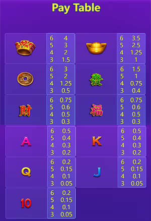 สัญลักษณ์ เรียง 6 ตัว เรียง 5 ตัว เรียง 4 ตัว เรียง 3 ตัว หมวกทองคำ 4 3 2 1.5 ก้อนทองคำ 3.5 2.5 1.25 1 เหรียญทอง 3 2 1.25 0.5 ตัวอักษรจีนสีเขียว (發) 1.5 1 0.75 0.4 ตัวอักษรจีนสีแดง (財) 0.75 0.6 0.5 0.3 ตัวอักษรจีนสีชมพู (福) 0.75 0.6 0.5 0.3 A 0.5 0.4 0.3 0.2 K 0.5 0.4 0.3 0.2 Q 0.2 0.15 0.1 0.05 J 0.2 0.15 0.1 0.05 10 0.2 0.15 0.1