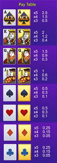 สัญลักษณ์ x5 x4 x3 Ace (เอโพดำ) 2.5 1.5 0.5 King (เค) 2 1.2 0.4 Queen (แหม่ม) 1.5 0.9 0.3 Jack (แจ็ค) 1 0.6 0.2 โพดำ (Spades) 0.5 0.3 0.1 โพแดง (Hearts) 0.5 0.3 0.1 ข้าวหลามตัด (Diamonds) 0.25 0.15 0.05 ดอกจิก (Clubs) 0.25 0.15 0.05