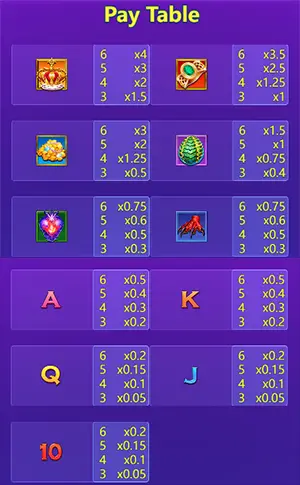 SCATTER (สัญลักษณ์หีบสมบัติ): * เมื่อสัญลักษณ์ SCATTER ปรากฏ 4 ตัว จะได้รับโบนัสเกม (Bonus Games) 8 รอบ และจะได้รับโบนัสเกมเพิ่มอีก +2 รอบ สำหรับสัญลักษณ์ SCATTER แต่ละตัวที่ปรากฏเพิ่มขึ้นมา